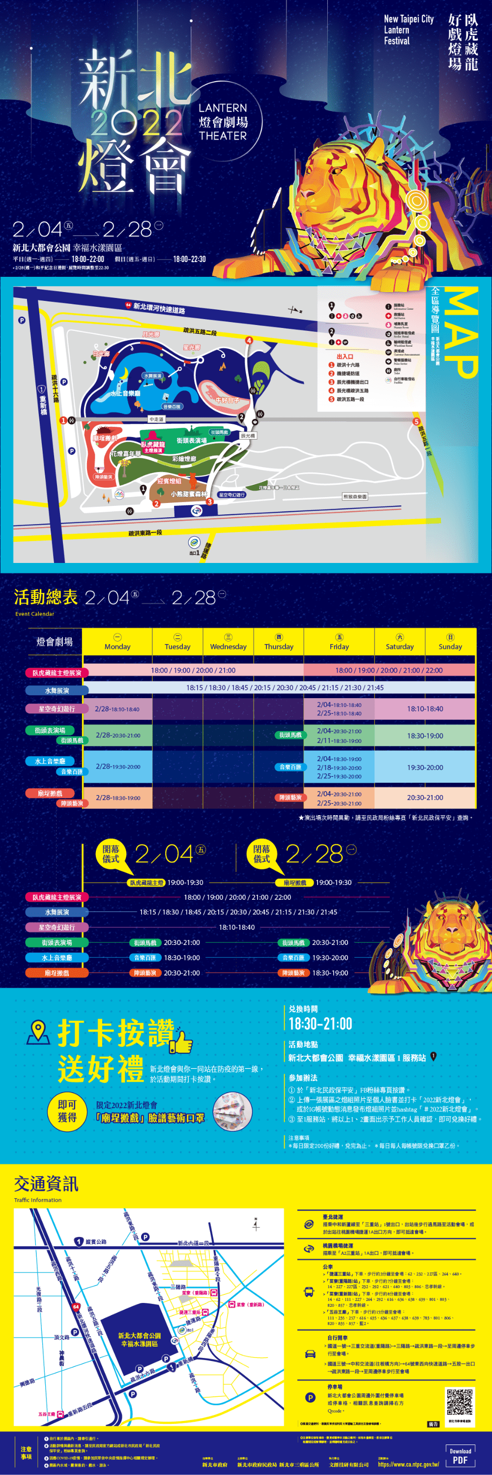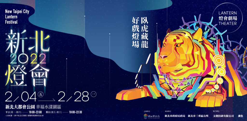 2022台灣燈會在高雄!還是有很多朋友無法前往現場賞燈,沒關係!2/04-2/28將近一個月的期間,在新北大都會公園-幸福水漾園區舉辦「2022 新北燈會 好戲燈場」。全台首創以「燈會劇場」為主題,將整個大都會公園打造大型劇場,量身定做7大主題燈區,規畫6大類型的演出,2022新北燈會福虎迎春,呼朋引伴休揪大夥兒一起來賞燈會吧!