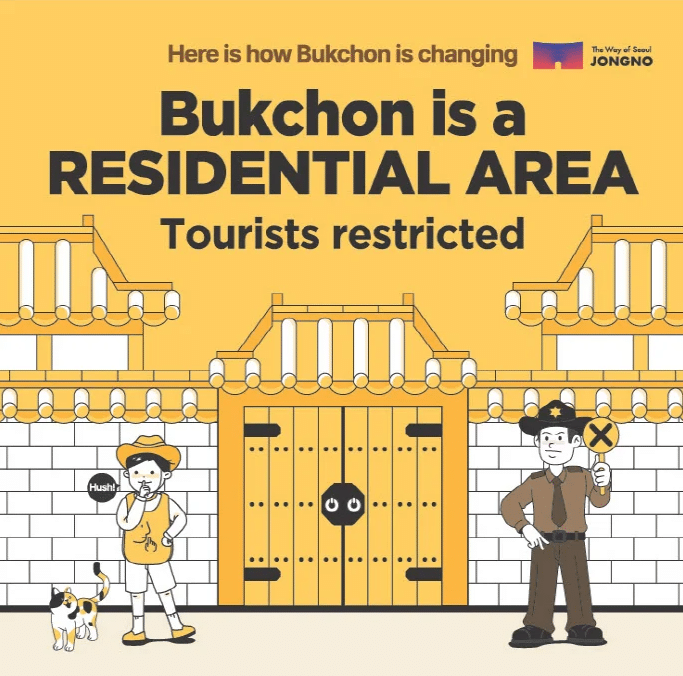 自2025年3月1日起,北村韓屋村開始實施宵禁政策,近年來北村因為「過度旅遊」,當地居民的生活環境受到了非常大的影響,許多遊客在韓屋村裡吸菸、亂丟垃圾、大聲喧嘩等,甚至擅自闖入民宅,讓居民深受其擾。