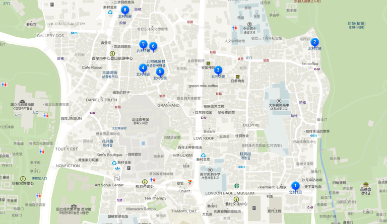 「北村八景」是韓屋村裡著名的八個點,各可以看到韓屋村不同角度的美景,遊客可以沿著地圖,依序蒐集這八個地點,不過走完全程大概要兩個多小時,記得要穿好走的鞋子!而因為一、二景的位置較偏遠,若是時間有限的人可以只去四~七景,其中最多人會拍照打卡的為五、六景。也有很多人在參觀之前會先租借韓服,體驗一日韓國貴族。