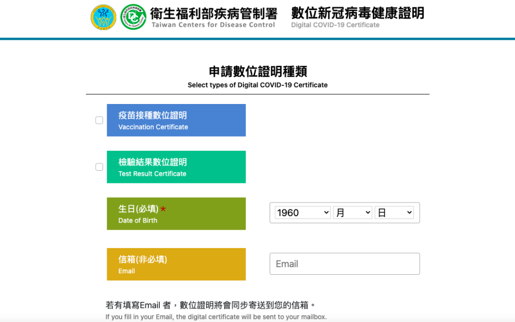 「疫苗接種數位證明」或「檢驗結果數位證明」(兩者皆可勾選) 但要注意的是,在國外接種之COVID-19疫苗劑次不納入本數位健康證明。