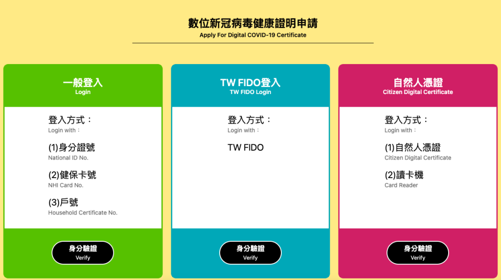自然人憑證登入:自然人憑證+讀卡機 護照登入(外國人):統一證號+護照號碼