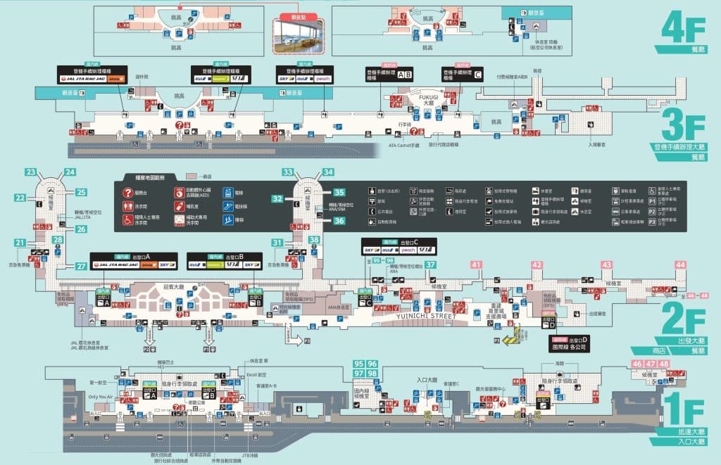 那霸機場分為國內線航廈與國際線航廈,但兩者有空橋互通,無需接駁車也能步行移動。各樓層簡介如下:
