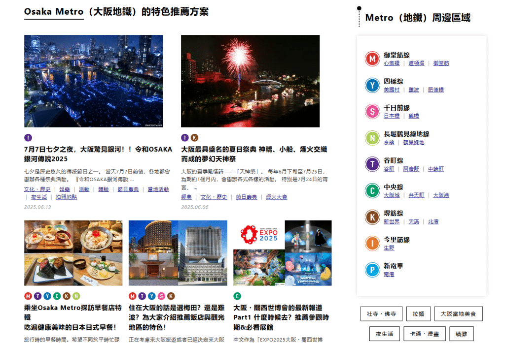 大阪地鐵(Osaka Metro)共有9條路線,在大阪地鐵圖上則可以看到以不同顏色及字母代表每條地鐵路線。而Osaka Metro NiNE提供了大阪地鐵圖查詢系統,除了各站的基本資訊外,還可以根據各個地鐵站搜尋附近的推薦景點及美食,是規劃行程時的好幫手!