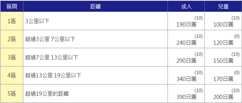 一般票價指的是單程票價格,而票價會根據距離分區而有所不同,成人票則從190日圓~390日圓不等。