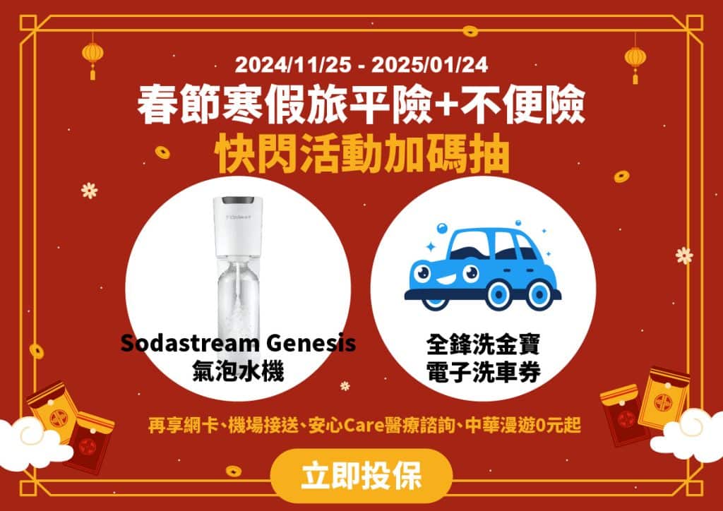 活動期間,所有網路投保旅遊綜合保險的保戶都可參加月月抽獎!無論保費金額大小,您都將有機會中獎,獎品包括「Sodastream Genesis氣泡水機」及「全鋒洗金寶電子洗車券」等,精彩獎品等您來拿!