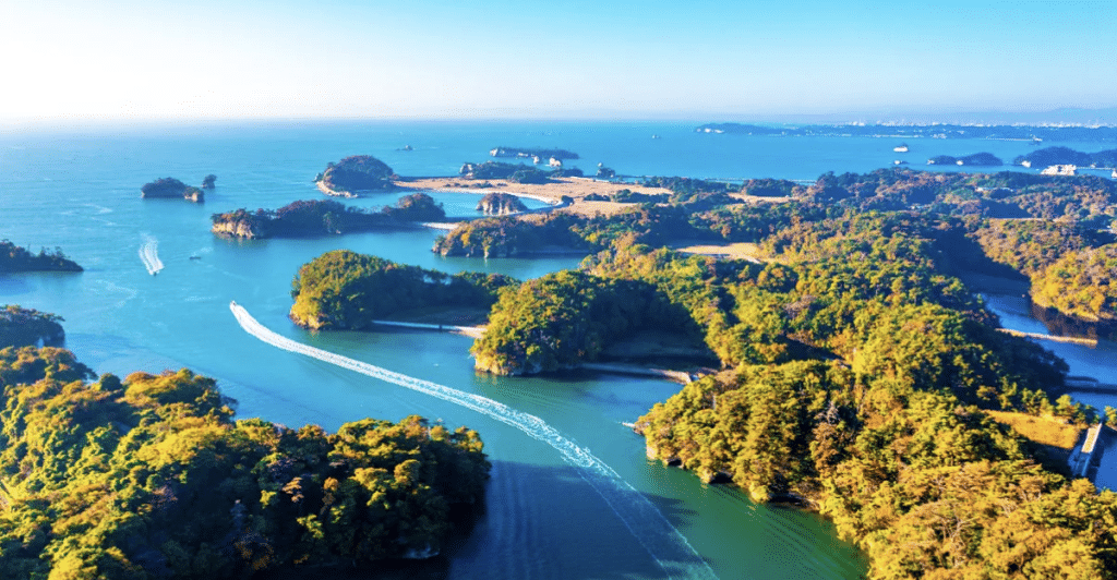 松島灣內約260個小島散落海面上,構成一幅夢幻般的自然景象。遊客可搭乘觀光船近距離欣賞這些被綠樹覆蓋的小島,還可參觀名剎瑞巖寺,體驗自然與歷史的完美結合。