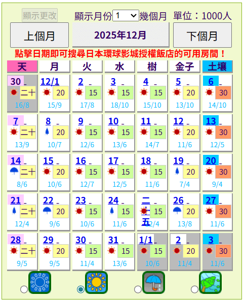 除了環球影城價格日曆,也可以用大阪環球影城授權的第三方人數預測網站判斷當天人人潮唷!