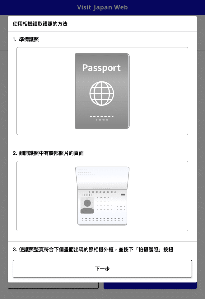 點選下一步後是登錄護照資料,利用相機讀取護照,便會自動帶入個人資料。