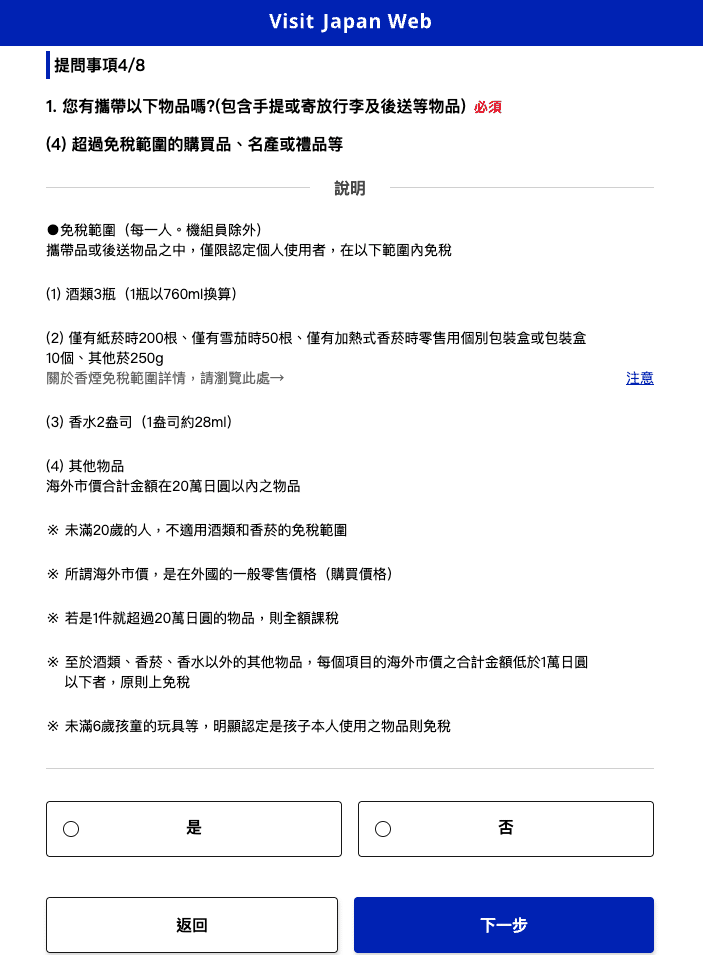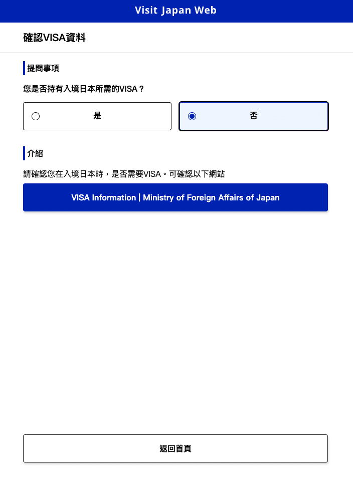 成功登入後點選「本人資料」,這項步驟是為了確認外國人入境或本國人回國手續。所以如果是台灣入境日本的旅客前兩個問題都填否,至於是否使用免稅QR碼則視個人需求填寫,免稅QR碼勾選的差別在於購物免稅不需再出示護照,直接使用Visit Japan Web的QR碼代替護照,不過還是要先確認該店家是否提供此服務。