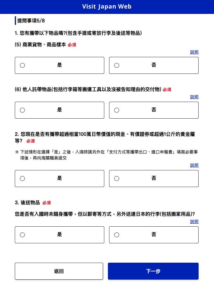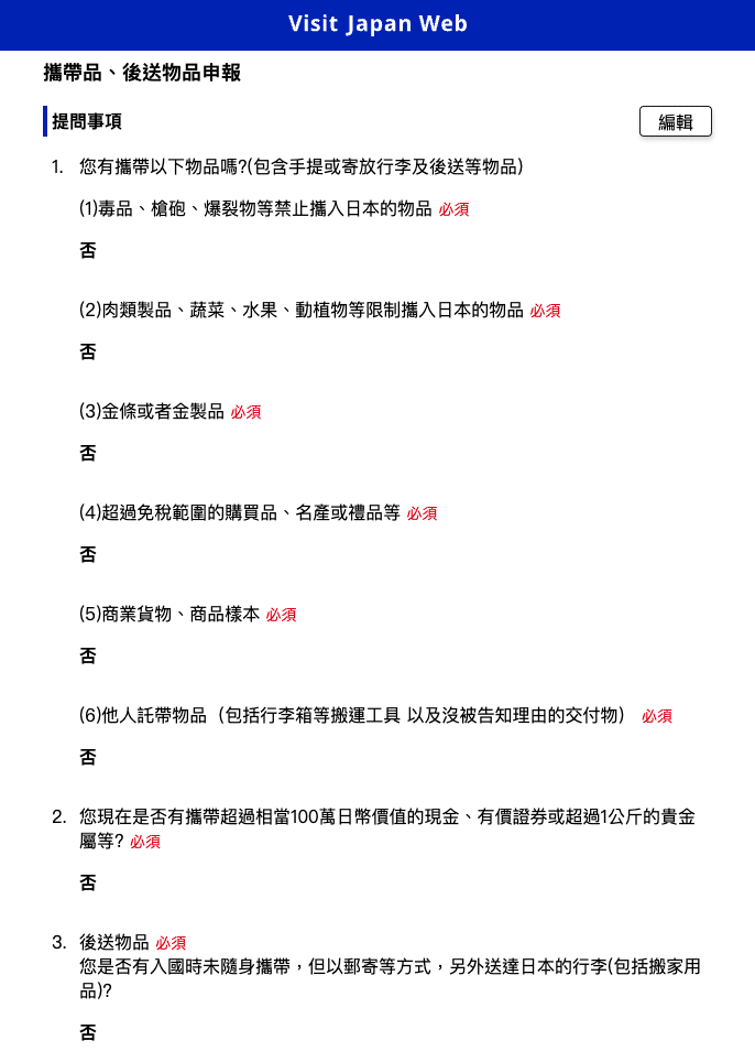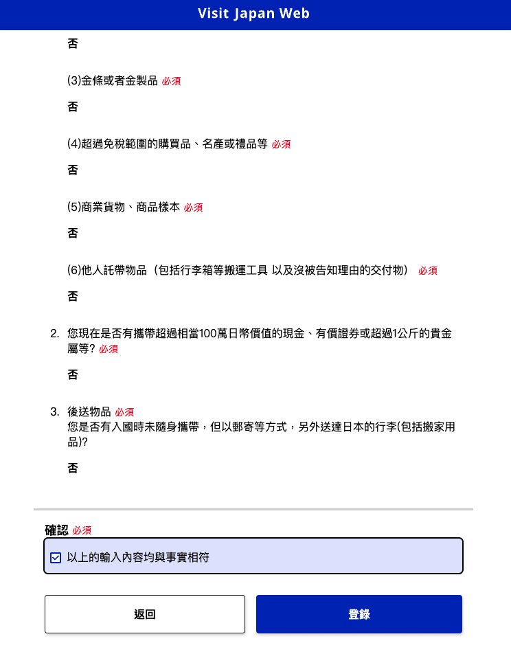 在手續畫面裡的入境審查以及海關申報上登錄資訊。